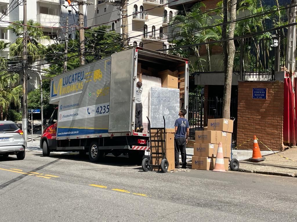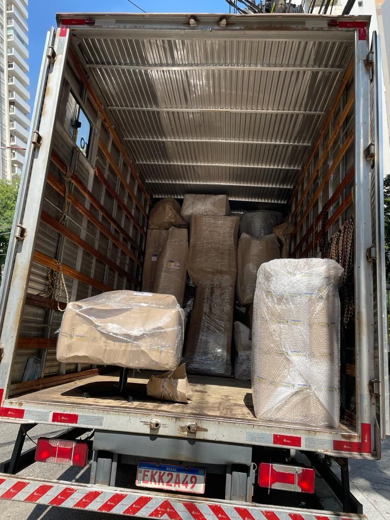 Assim que todos os itens estiverem devidamente embalados, nossa equipe iniciará o carregamento dos itens para um caminhão baú, onde estes serão alocados com mantas protetoras e cordas, garantindo segurança durante todo o trajeto.